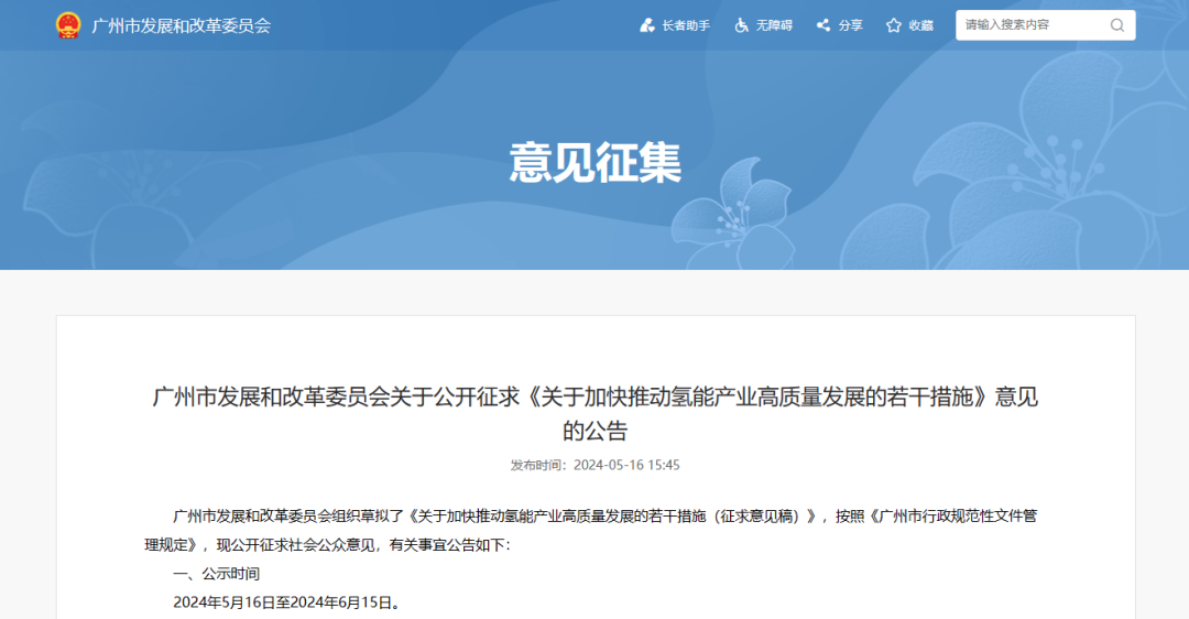 5月16日,广州市发展和改革委员会发布《关于加快推动氢能产业高质量发展的若干措施》征求意见稿。该文件提出涵盖氢能制、储、输、用全产业链的二十项支持措施,积极构建广州市氢能产业体系,促进氢能产业产学研用协作,支持当地氢能产业持续健康发展。