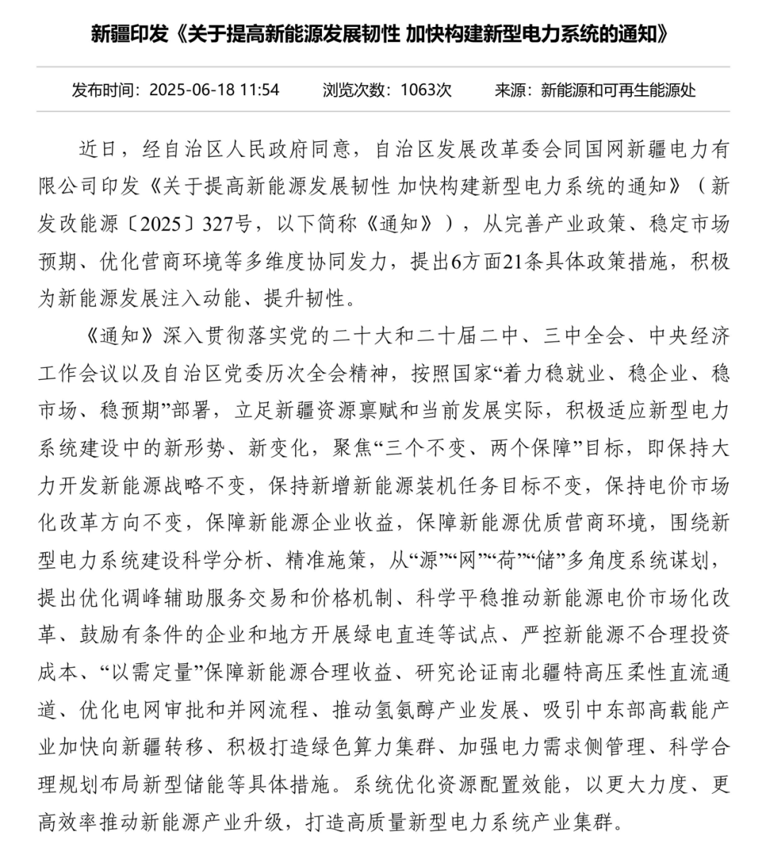 近日,新疆维吾尔自治区发展改革委会同国网新疆电力有限公司印发《关于提高新能源发展韧性 加快构建新型电力系统的通知》(以下简称《通知》),鼓励有条件的企业和地方开展绿电直连等试点,并提出要推动氢氨醇产业发展、积极打造绿色算力集群、科学合理规划布局新型储能等。