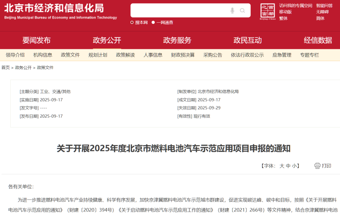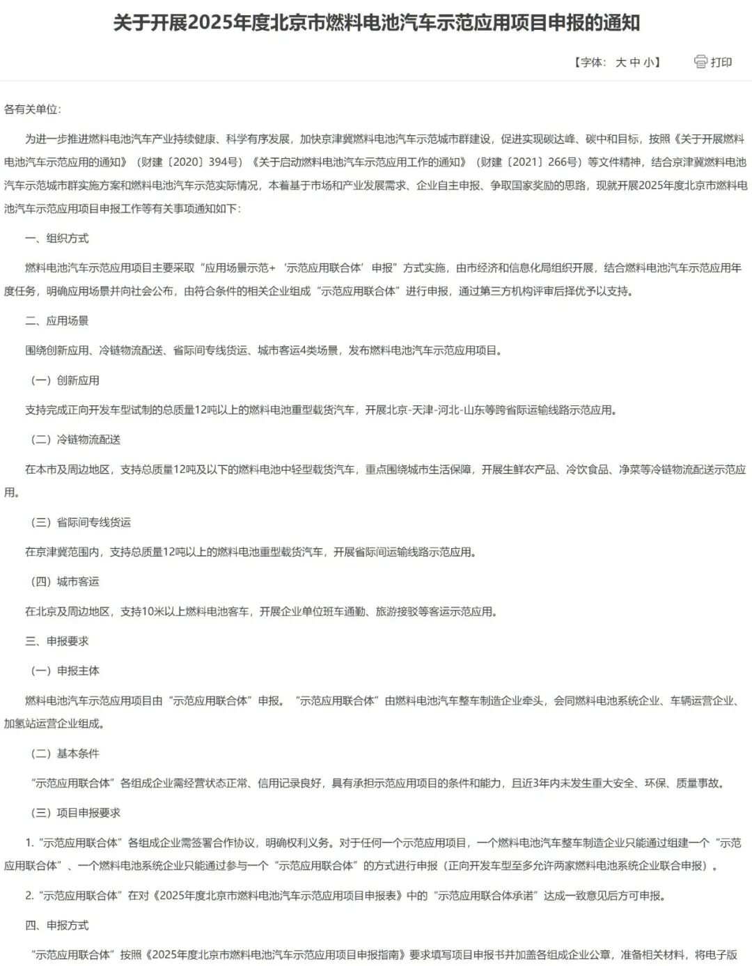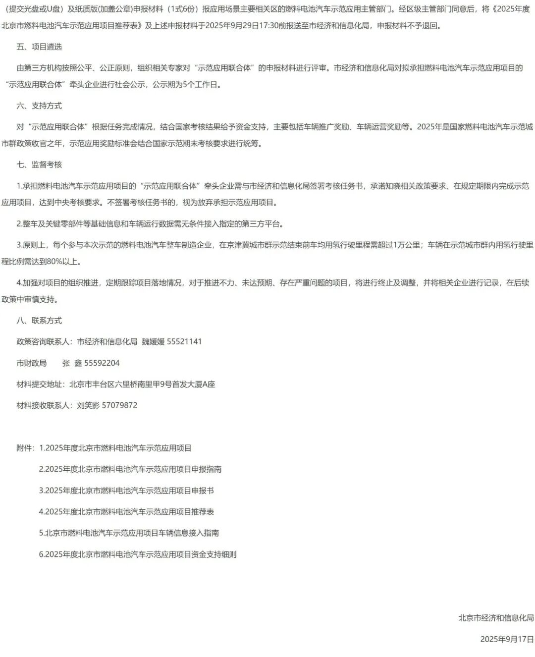 北京市燃料电池汽车示范应用项目申报的通知