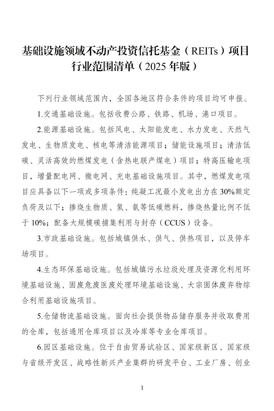 通知指出,为更好发挥基础设施REITs盘活存量资产、促进投资良性循环的作用,国家发展改革委对基础设施REITs发行范围作了进一步拓展,形成了《清单》。《清单》明确,在交通基础设施、能源基础设施等15个行业领域范围内,全国各地区符合条件的项目均可申报。能源基础设施行业领域的清洁低碳、灵活高效的燃煤发电(含热电联产煤电)项目,应具备以下一项或多项条件:纯凝工况最小发电出力在30%额定负荷及以下;掺烧生物质、氢、氨等低碳燃料,掺烧热量比例不低于10%;配备大规模碳捕集利用与封存(CCUS)设备。